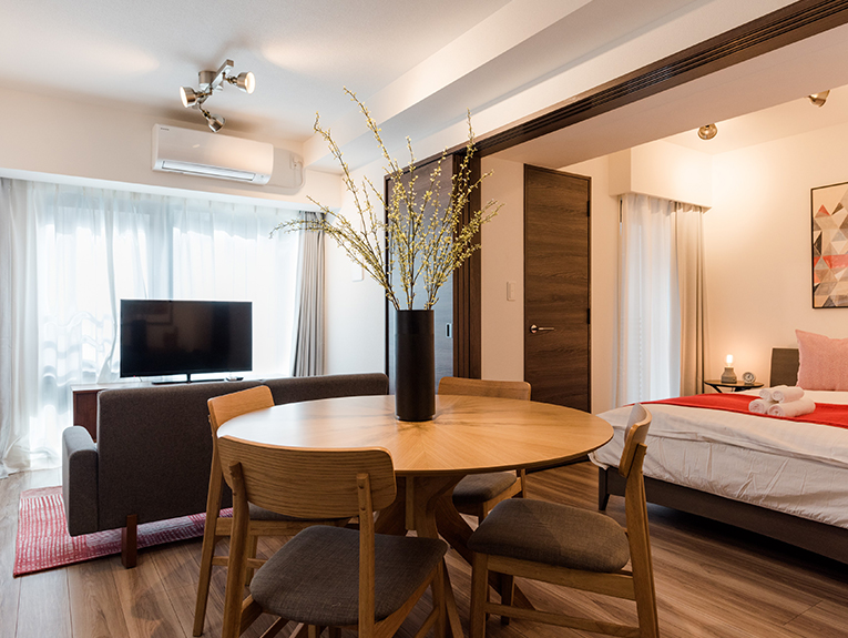 テレワークや海外からの一時帰国などにも最適 家具・キッチン・食器の他、高速インターネット設備等完備。